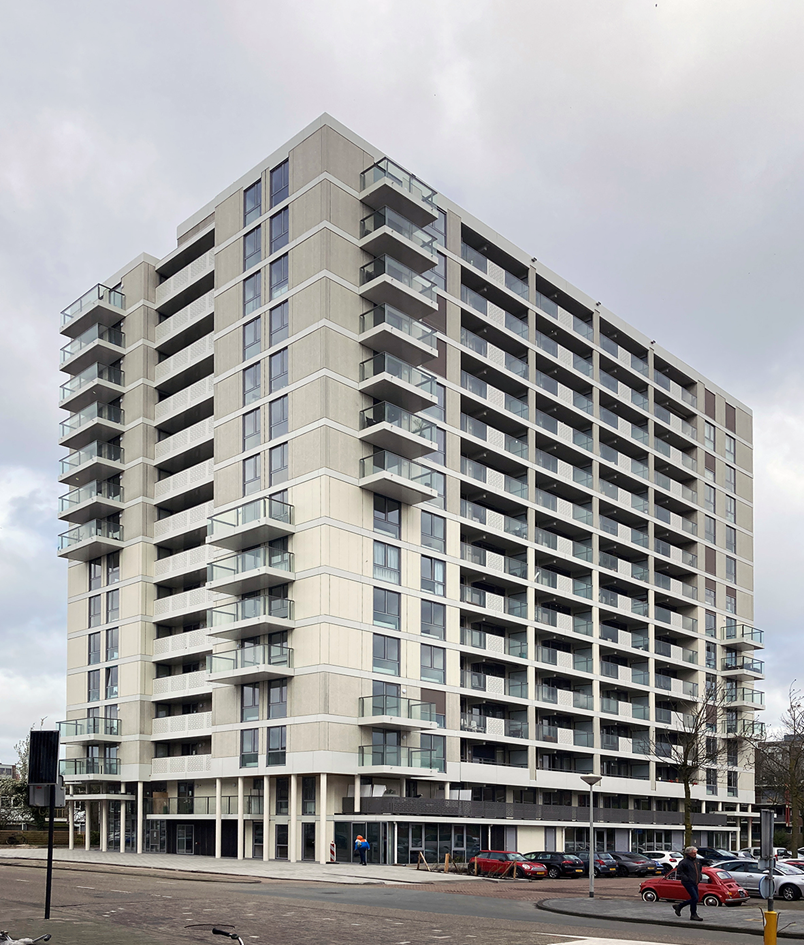 Statenjachtstraat, getransformeerd tot Lang Leven Thuisflat. 53 extra woningen en een gemeenschappelijke plint zijn toegevoegd.