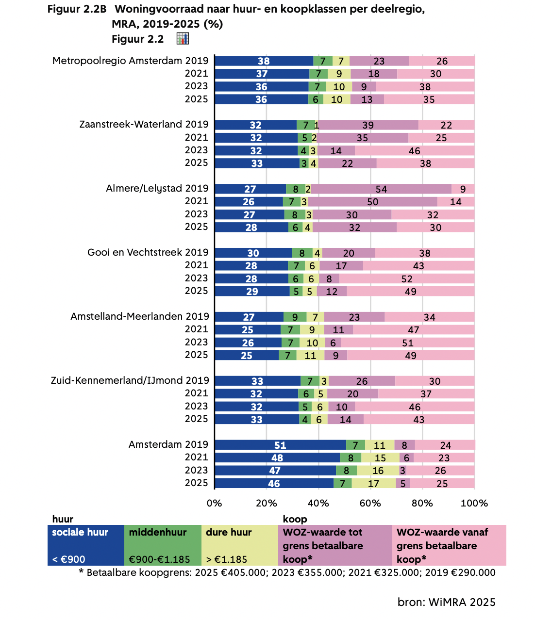 De woningmarkt in de Metropoolregio Amsterdam (MRA) blijft overspannen, ook al zijn er in 2024 14.000 woningen bijgekomen. Dat blijkt uit het tweejaarlijkse onderzoek Wonen in de Metropoolregio Amsterdam (WiMRA) 2025. Het percentage sociale huurwoningen in de MRA is met 36 procent gelijk gebleven. Het aantal huishoudens met een laag inkomen is aanzienlijk hoger: 44 procent. Voor wie een sociale huurwoning heeft, is wonen iets betaalbaarder geworden. De woonquote in de sociale huur – het deel van het netto inkomen dat opgaat aan wonen, dus inclusief stook-, elektriciteits- en servicekosten – is gedaald.
